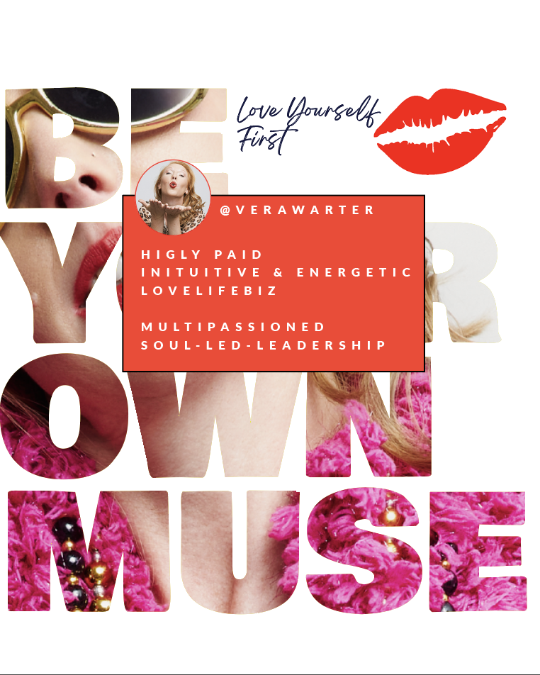 Vera Warter ist globale Visionärin, Art Direktorin, Lebenskünstlerin, Autorin und Führungspersönlichkeit aus Deutschland mit einem einfachen Ziel: Sie untesrtützt Frauen, wahre Erfüllung in der Selbstliebe zu finden, sich ganz im puren Sein zu verkörpern und durch Selbstbestimmung ihren Reichtum zu erschaffen, dan sie verdient!